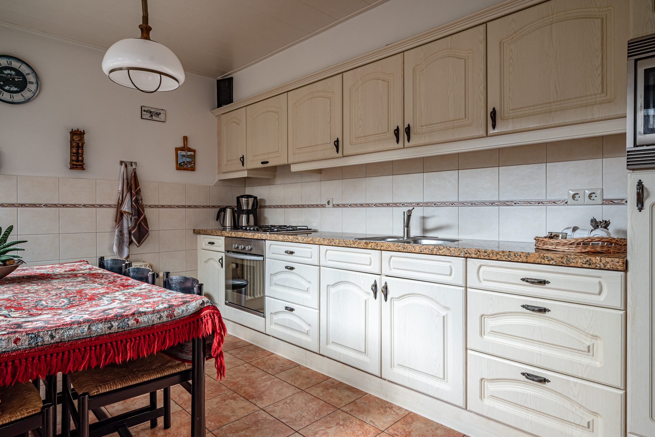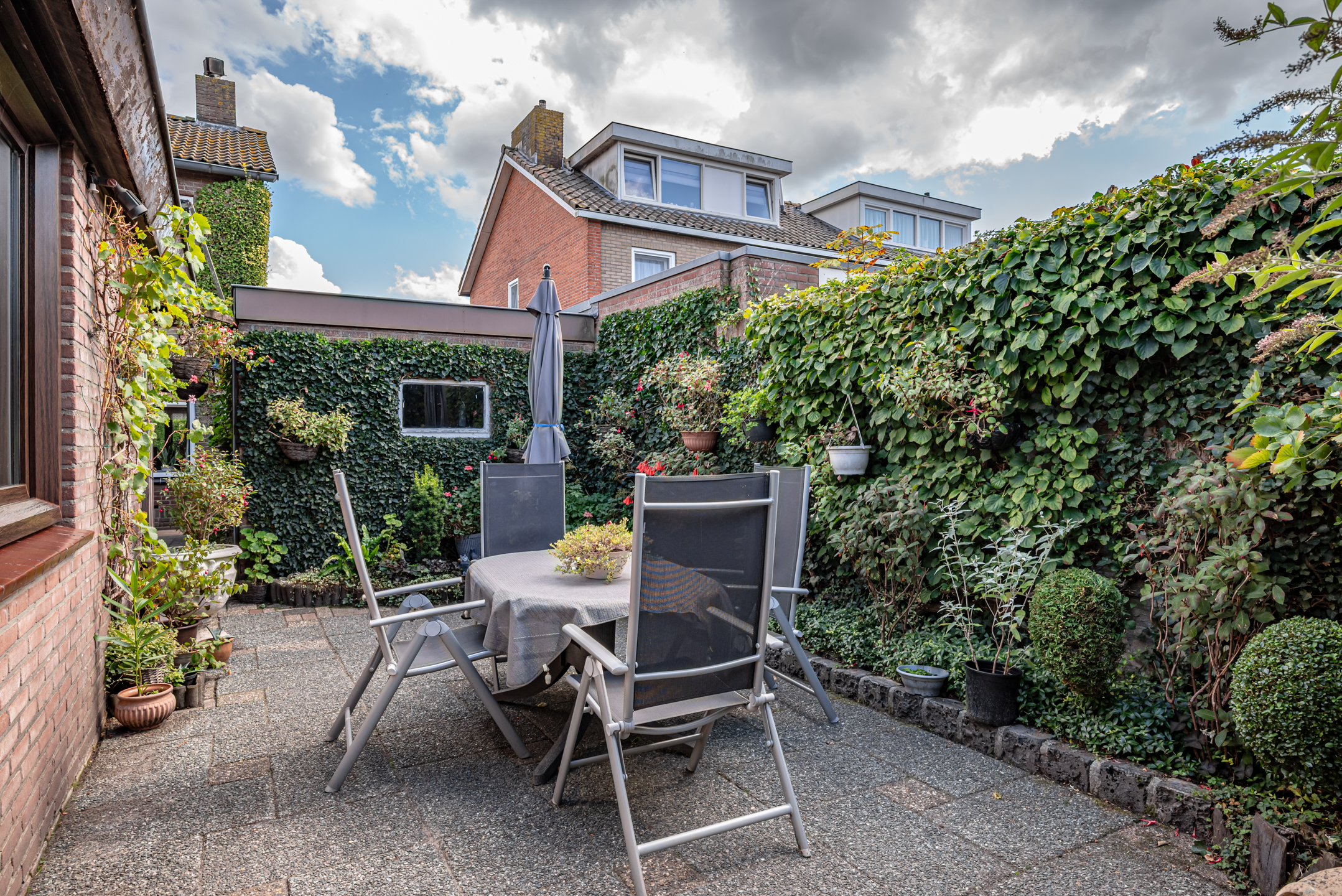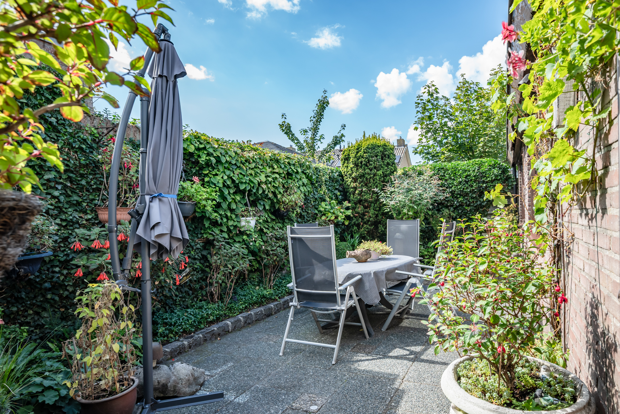 De achtertuin is besloten, voorzien van een terras en geeft toegang tot de werkruimte.