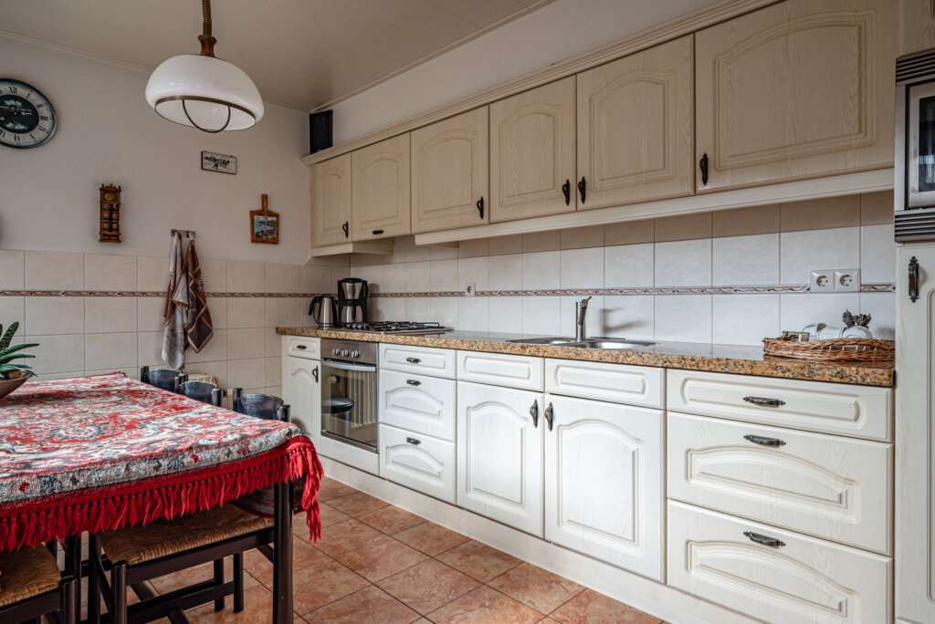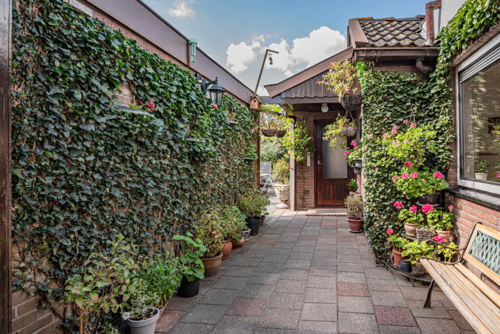 De achtertuin is besloten, voorzien van een terras en geeft toegang tot de werkruimte.