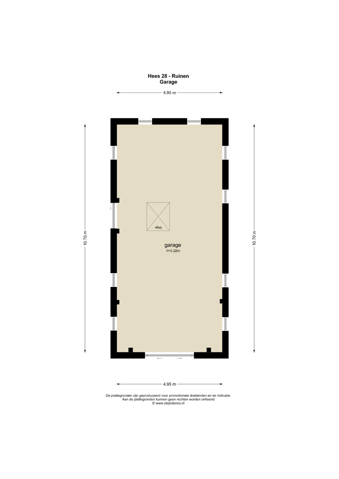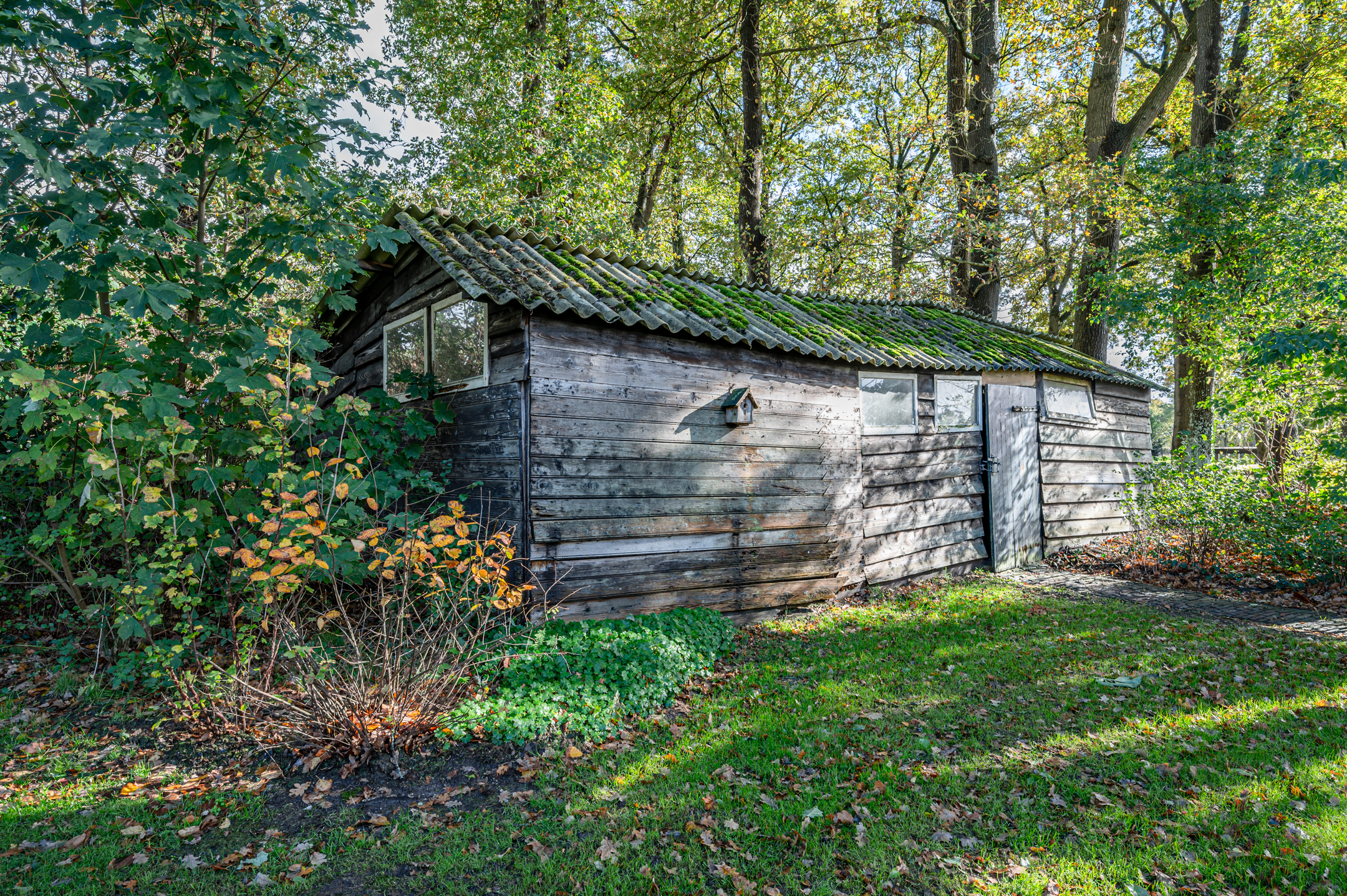Naast de woning staat een gemetselde, vrijstaande garage, voorzien van schuifdeur, zoldervloer, zadeldak gedekt met pannen en betonnen vloer. Achterop de kavel is een verouderde houten berging aanwezig.