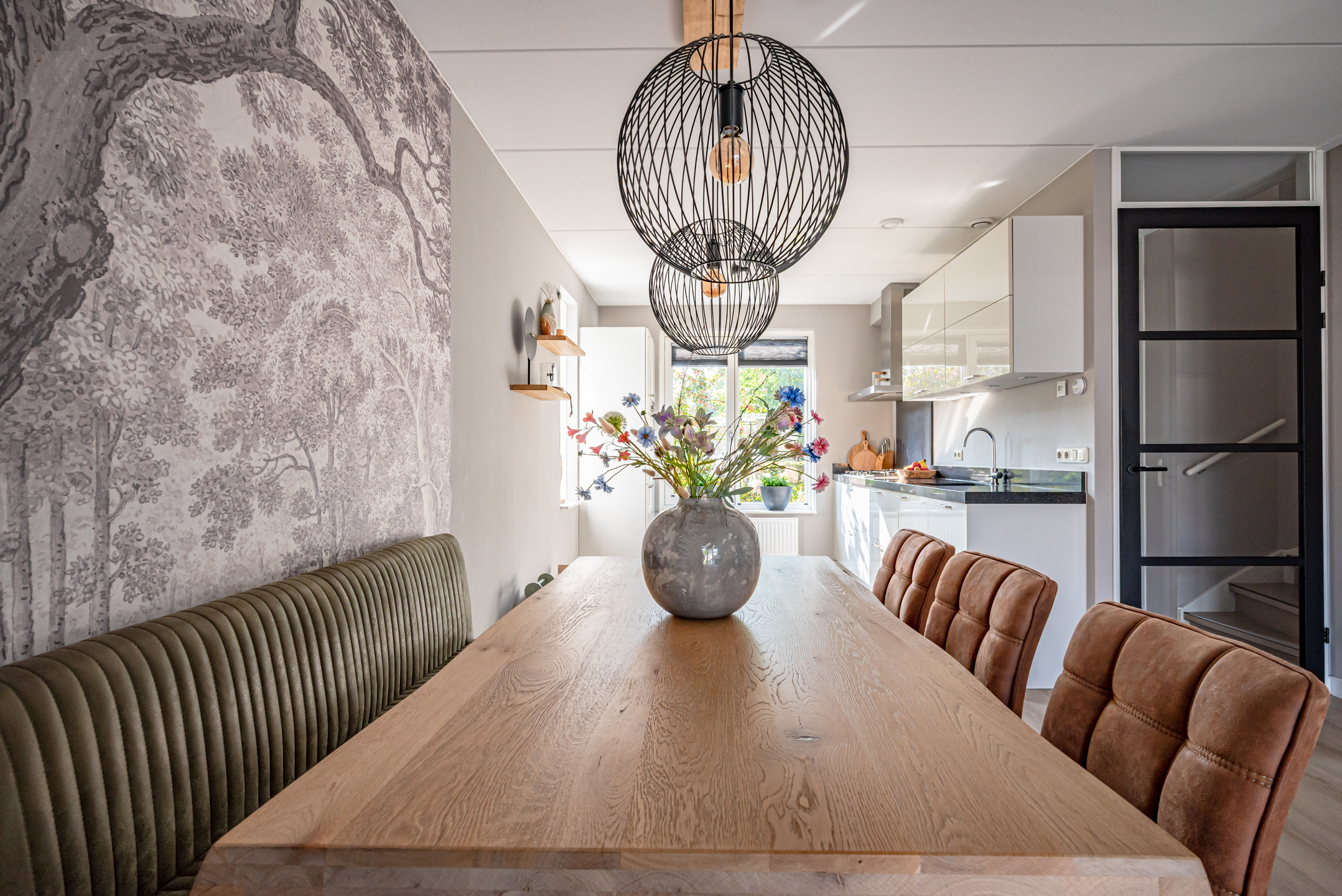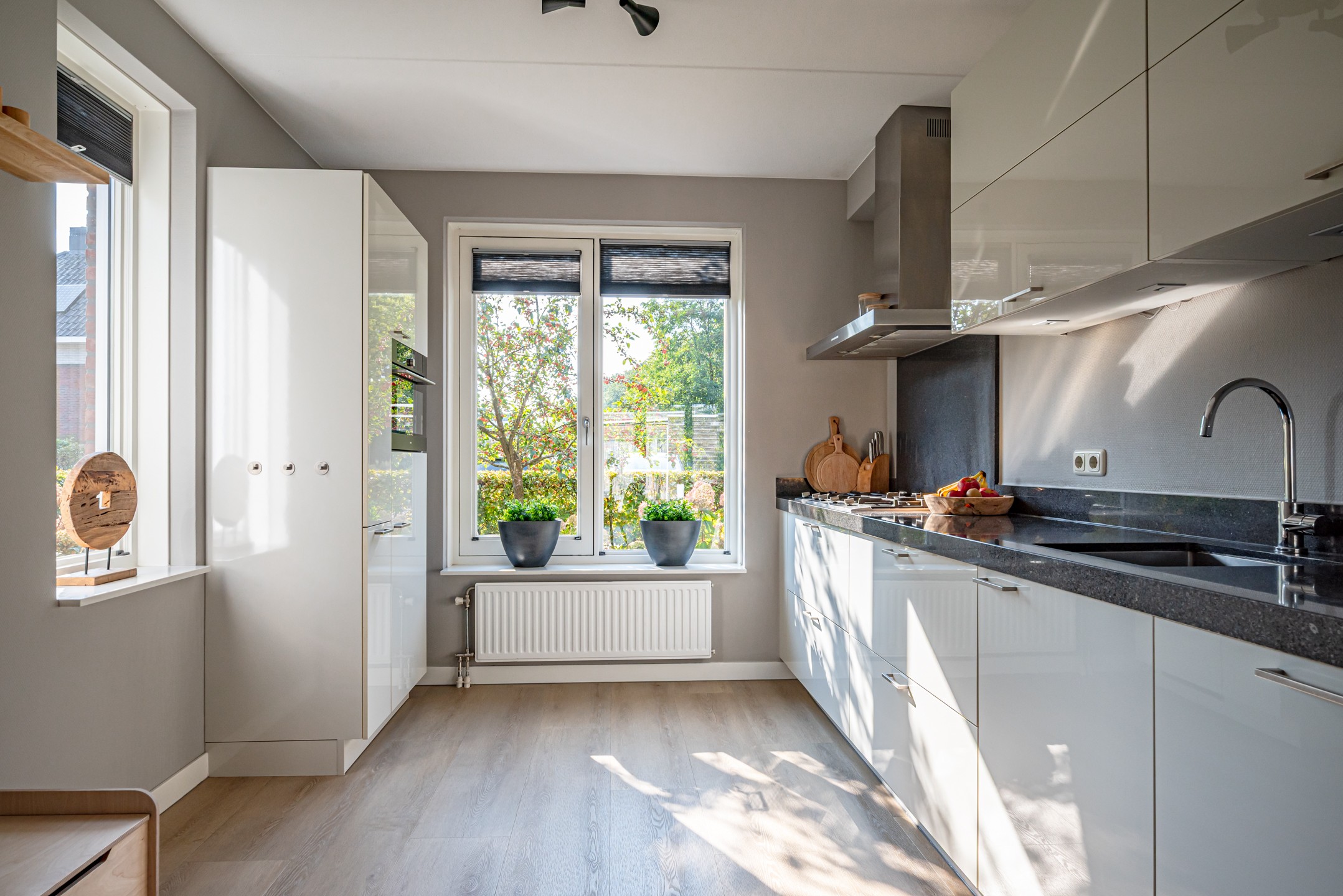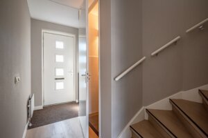 Begane grond: lichte entree/hal, meterkast, garderobe, toilet v.v. hangcloset en fontein, trapopgang, doorgang naar de smaakvol ingerichte woonkamer voorzien van PVC-vloerafwerking, ruime zithoek, eettafel en keukenopstelling straatgericht. Deze is ingericht met rechte opstelling voorzien van gaskookplaat, afzuigkap, vaatwasser en kastruimte. Een hoge opstelling biedt ruimte aan o.a. koelkast en combi-magnetron. Een moderne, neutrale inrichting met veel lichtinval zorgt voor een rustige en sfeervolle leefruimte!