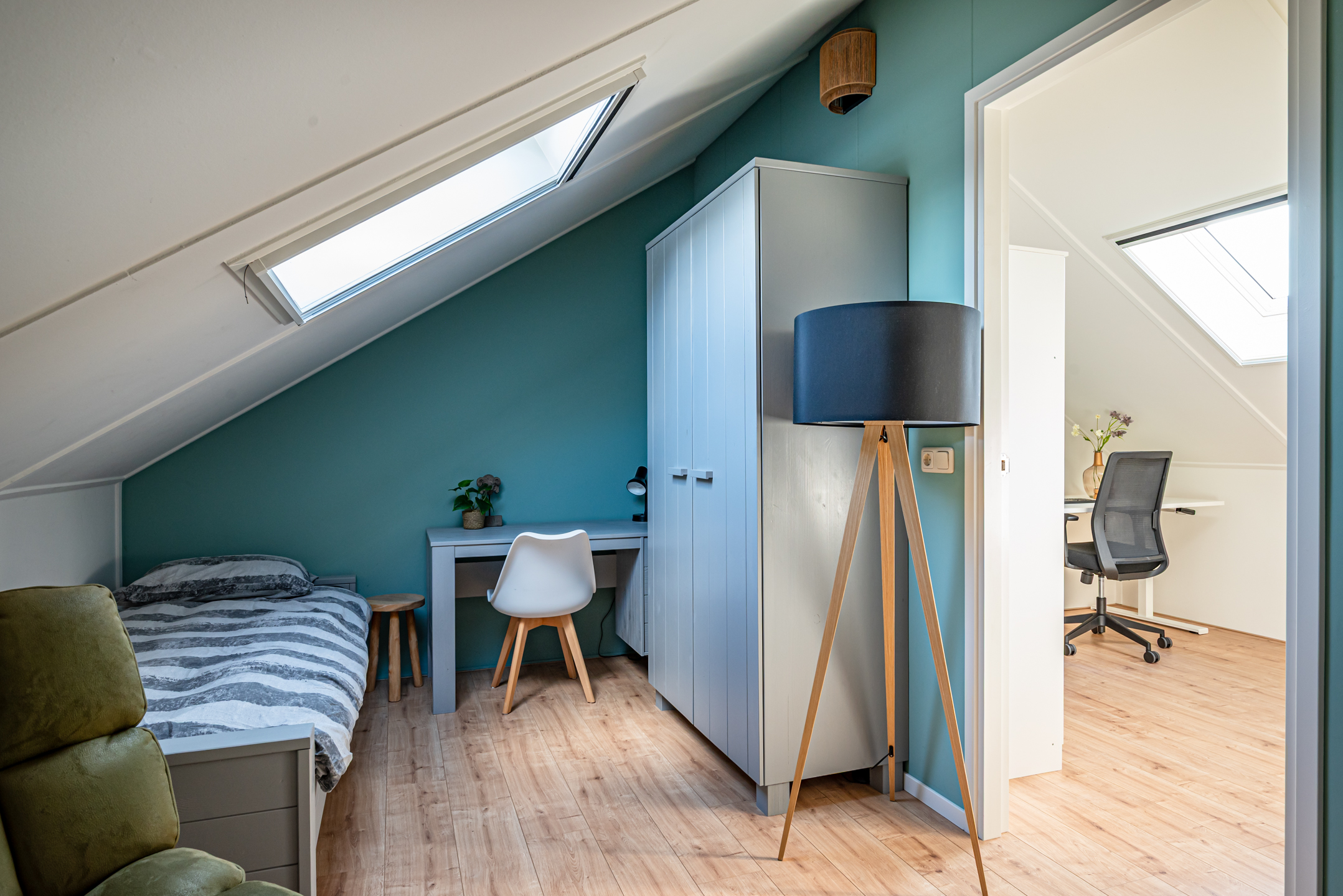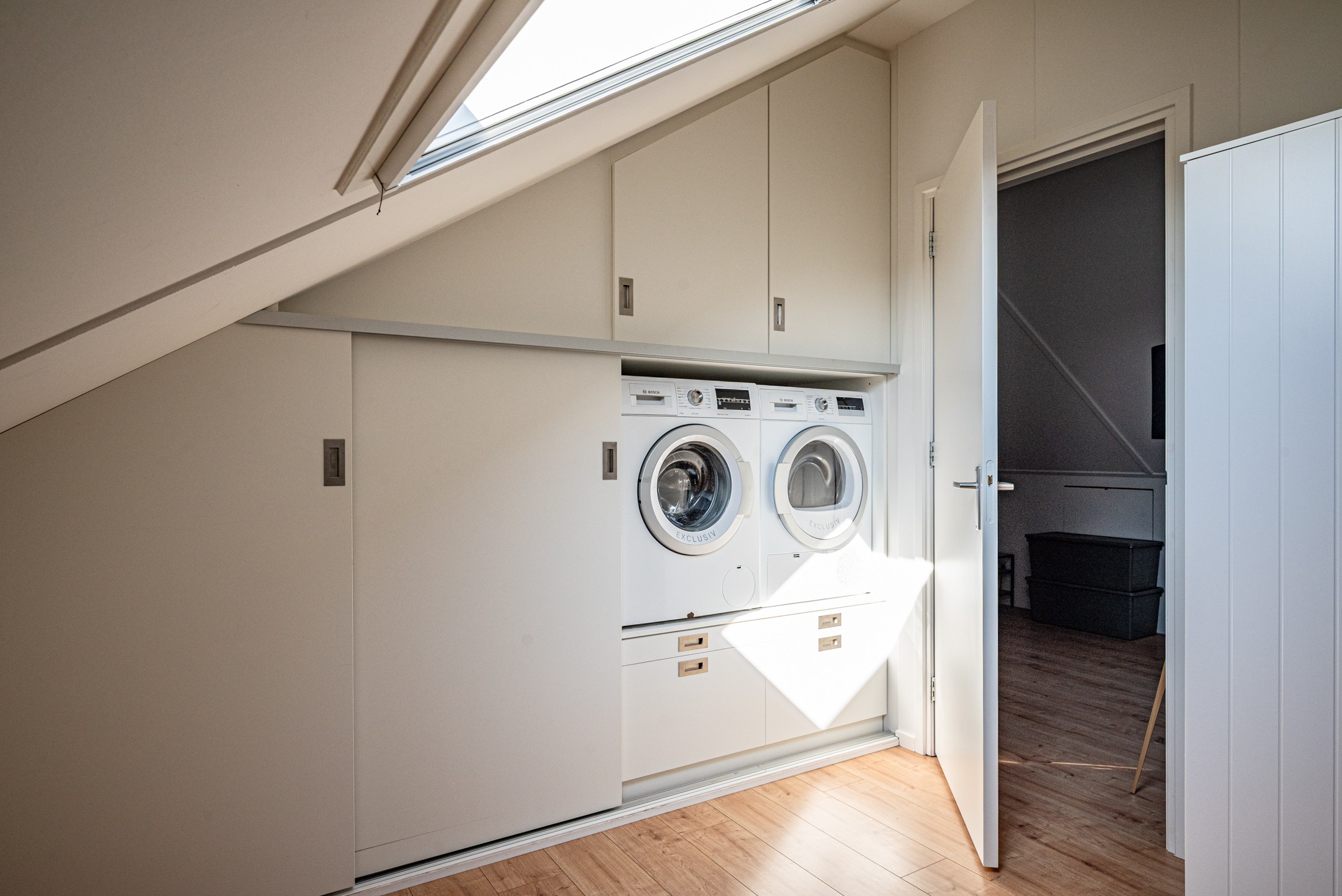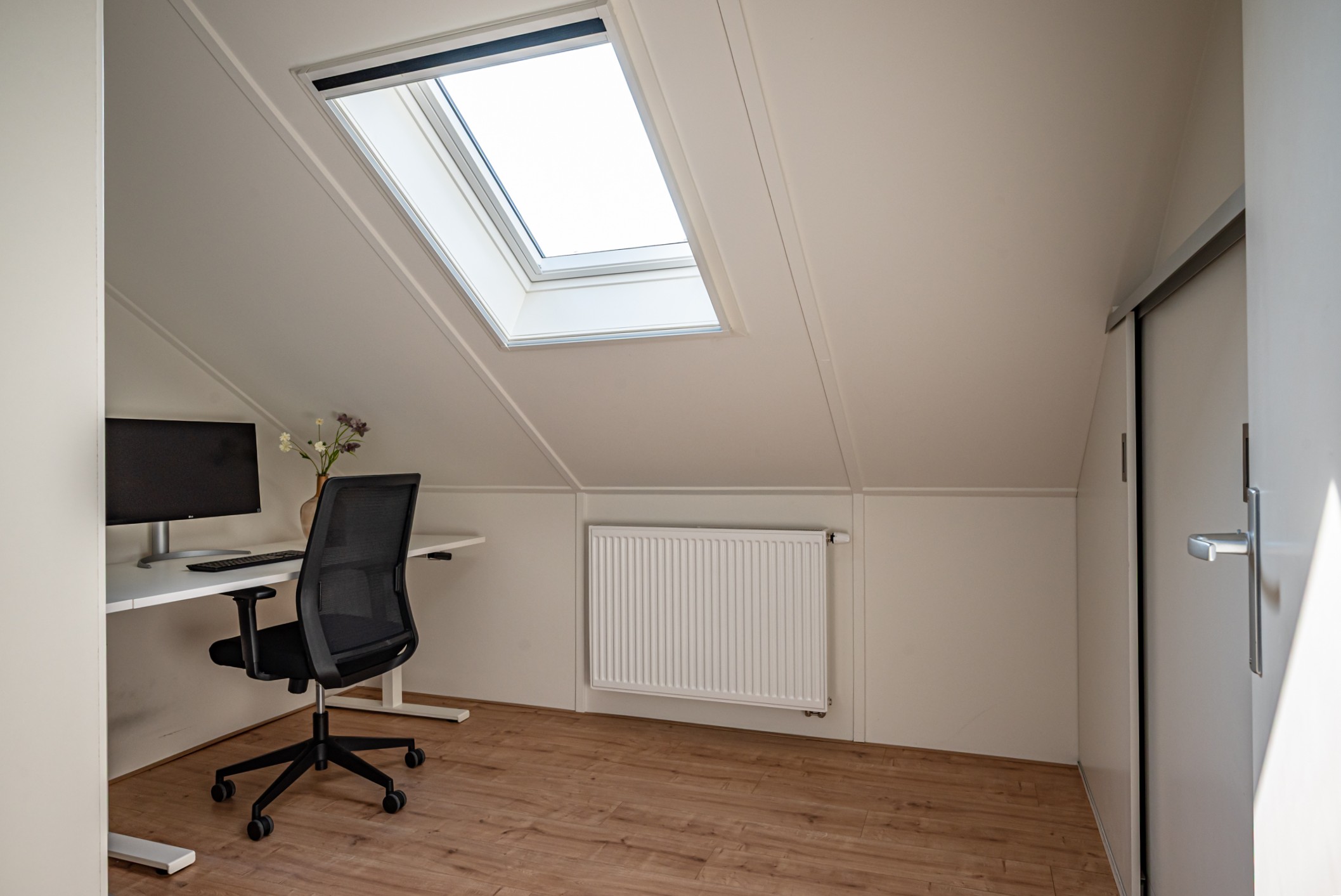 Tweede verdieping: eveneens bereikbaar middels vaste trap en afgewerkt met 2 kamers, waarvan 1 slaapkamer en 1 thuiswerkplek met was- en bergruimte. Door 2 royale dakramen is hier voldoende lichtinval. Een prachtige extra woonruimte!