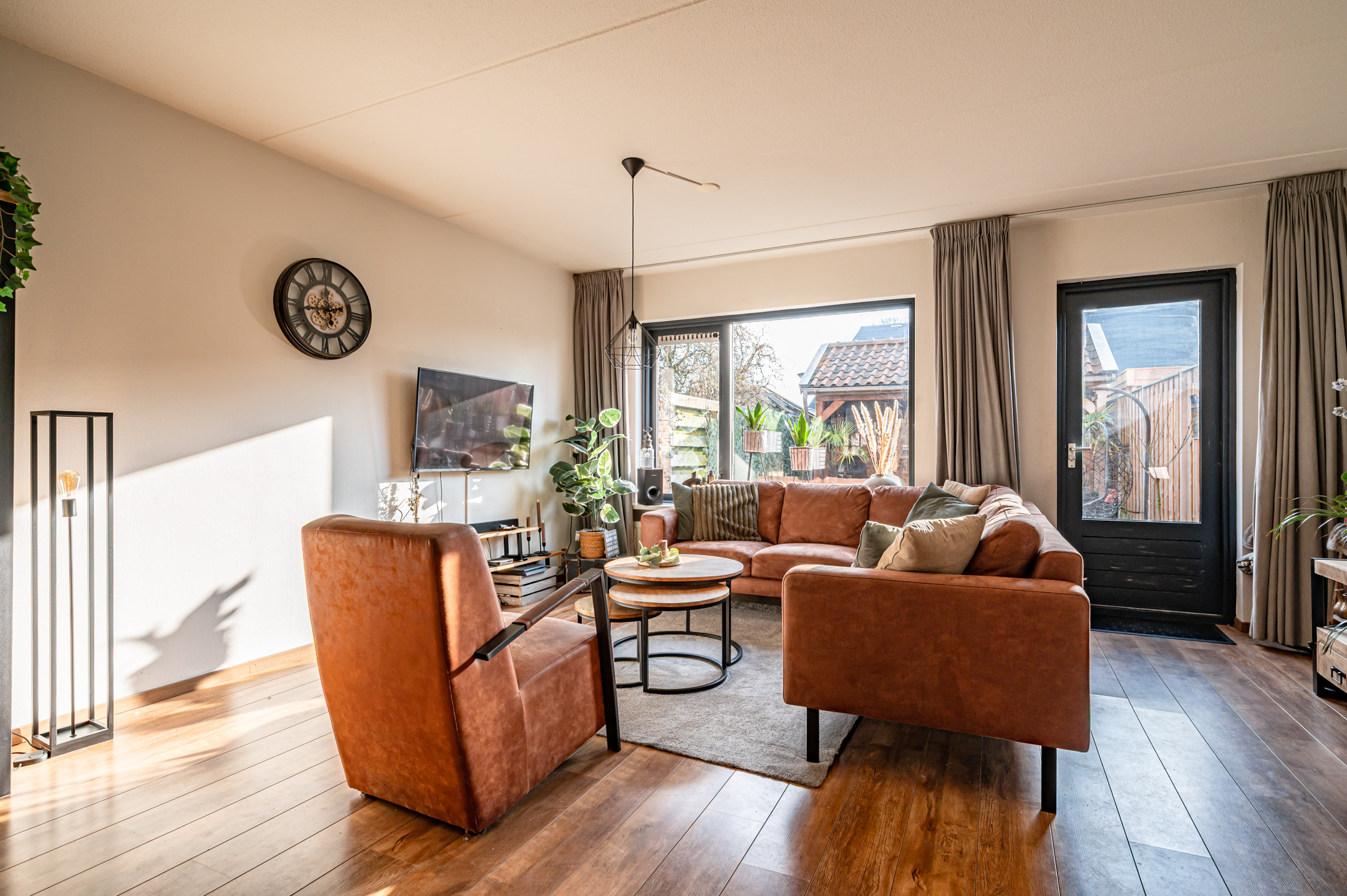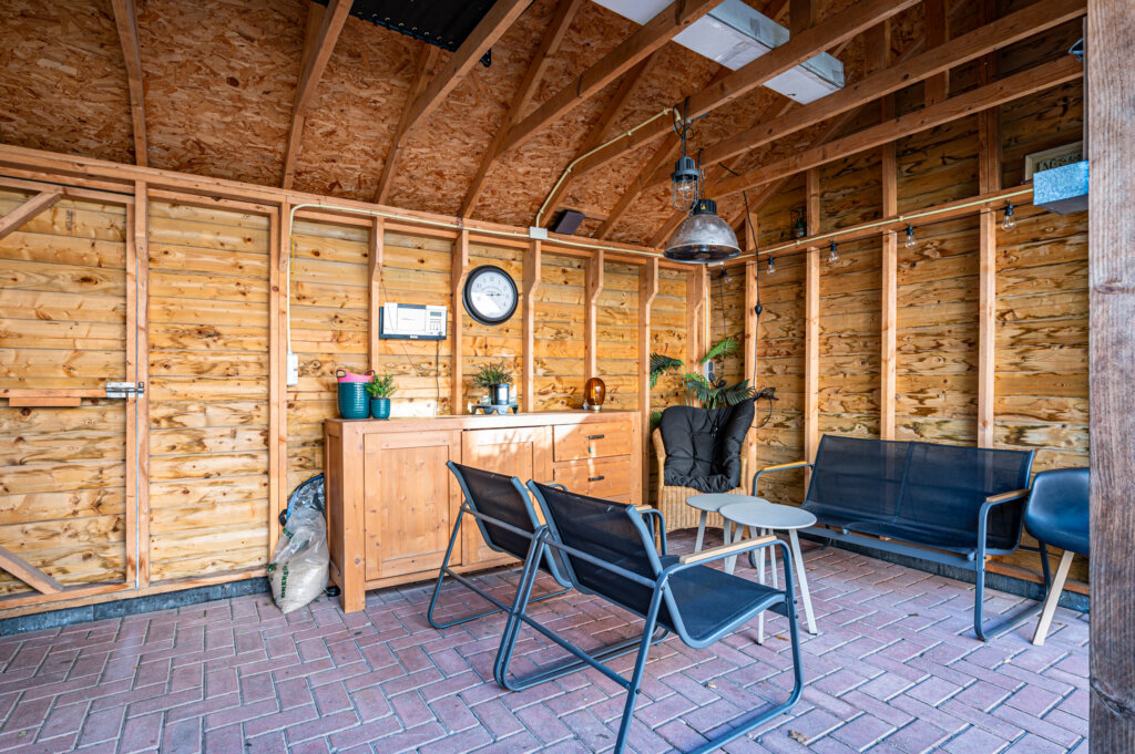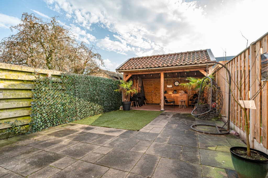 De achtertuin is gunstig gelegen op het zuidoosten en beschikt over een zonnig terras en een fijne zitplek onder de houten overkapping.